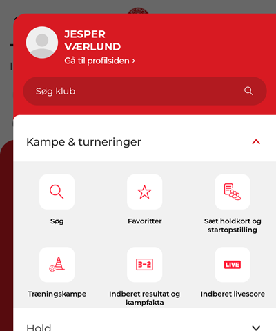Vælg "Indberet resultat og kampfakta" under afsnittet "Kampe & Turneringer" i menuen: